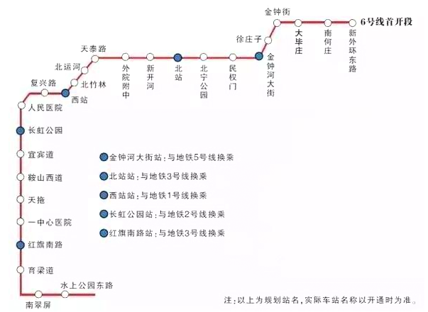 天津地铁 6号线 ,北起南孙庄,南至咸水沽西,线路全长61千米,共设车站48座,设大毕庄车辆段和尖山路停车场。沿线经过 东丽区 、 河北区 、 红桥区 、 南开区 、 河西区 、 西青区 、 津南区 7个行政区,该线路在金钟河大街、肿瘤医院、天津宾馆、文化中心与地铁5号线换乘,形成"O型"环状线。