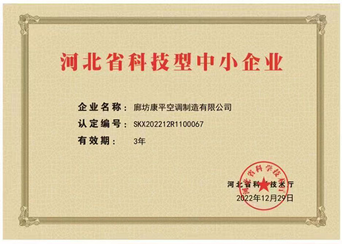 经过严格执行评价标准和流程,廊坊康平空调制造有限公司喜获河北省科学技术厅颁发的“河北省科技型中小企业”荣誉认定称号,之前,康平空调已获得“高新技术企业”认定。