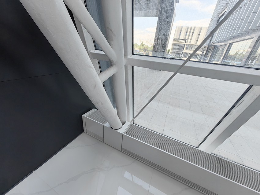 康平空调自主研发的可三维调节的幕墙对流散热器制作工艺及安装方法,通过U型卡槽微调装置实现对流罩前面板、对流罩顶面板和分区隔板的水平面和垂直面上下、前后、左右三维调节定位,分区隔板和幕墙散热器模块之间留出5-15mm缝隙,补偿幕墙长度的累计偏差,满足了幕墙散热器的安装精度要求。